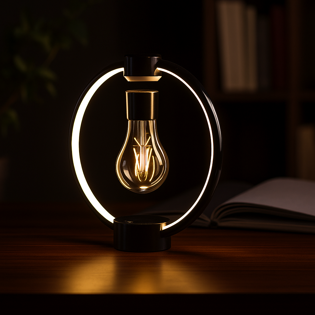 The Portal Night Light is an eye-catching addition to any room. It features a warm ring of light, with a suspended bulb at its center, using Maglev technology. There is no connection to the bulb directly. It relies on the wireless transfer of electricity to illuminate it. There is a single button controlling the lighting mode.